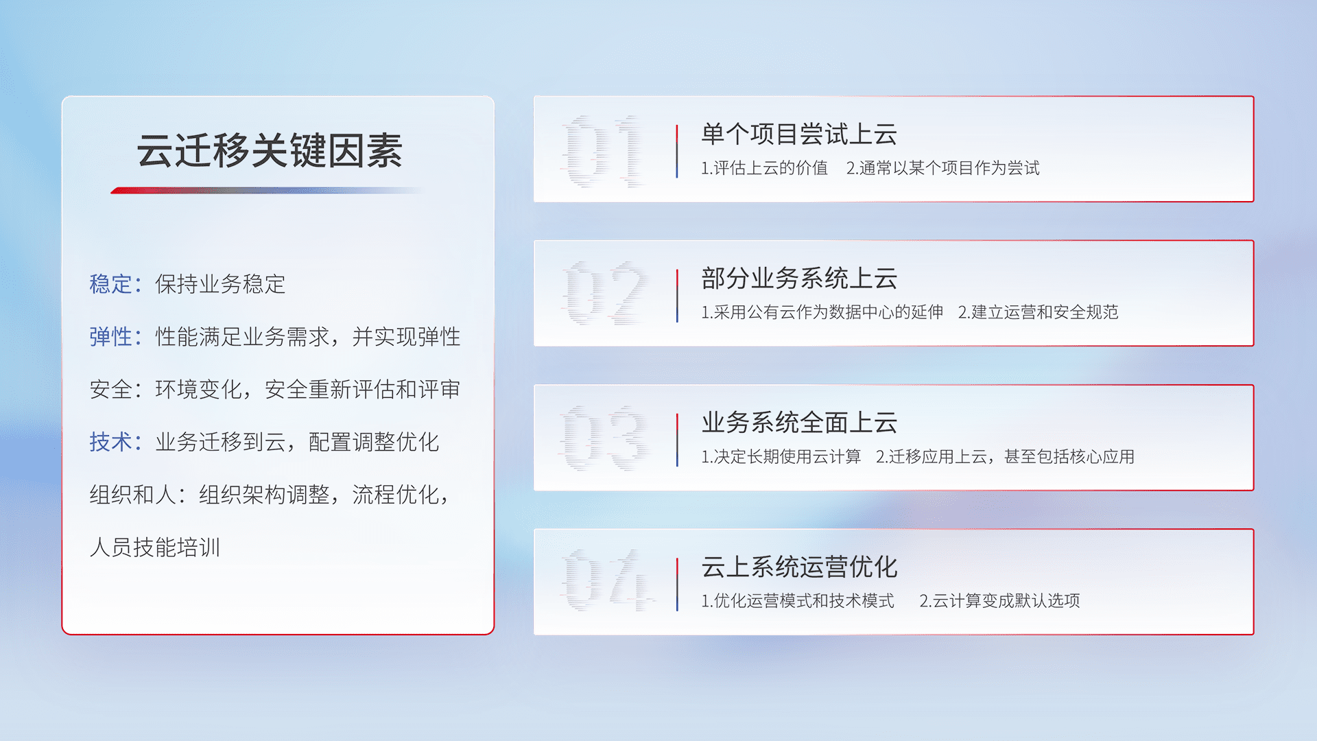 结合实际业务,,,从规划设计、、、、云平台选型、、云原生改造、、数据迁移、、集成交付,,迁移全过程为客户识别最佳上云路径,,,做好风险识别管理,,设计网络架构、、、身份权限、、、、安全审计合规、、操作审计、、日志审计、、、监控告警策略、、、多站点容灾设计等,,对云上基础设施进行整体规划,,,提升IT治理水平,,,,以满足弹性、、、、高可用、、、高性能的需求。。。。