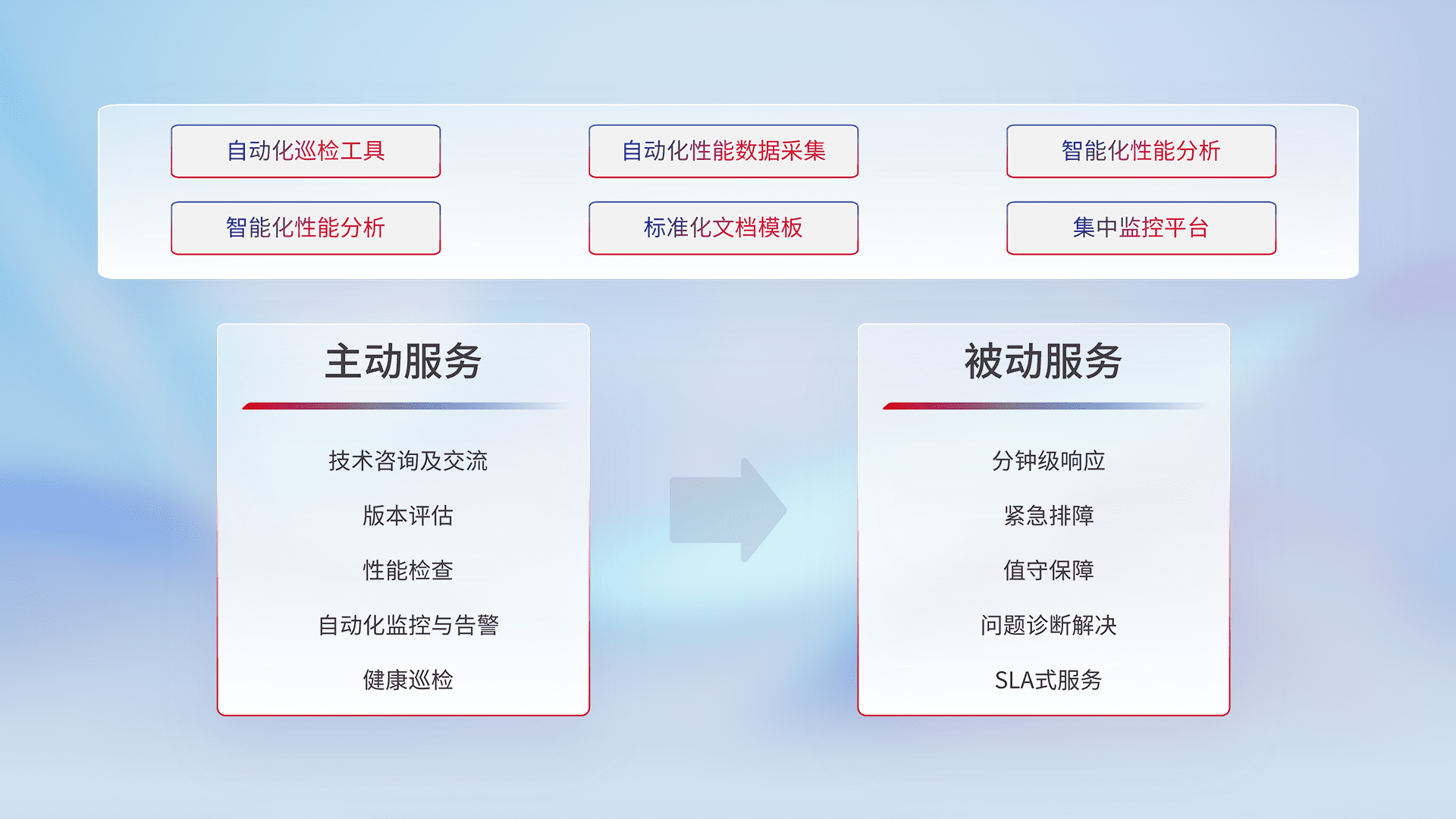 智能化工具和标准化文档,,,保障服务质量,,,提供主动服务(包含技术咨询、、版本评估、、、、性能检查、、、、自动化监控与告警、、健康巡检)和被动服务包含(分钟级响应、、、、紧急排障、、、、值守保障、、、问题诊断解决、、SLA服务)。。。。